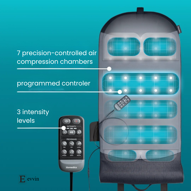 The mat inflates and deflates through multiple air chambers that lift and lower your body in wave-like motions. This movement decompresses the spine, promotes circulation, releases tight muscles, and helps restore natural posture — similar to assisted yoga stretches or spinal therapy.